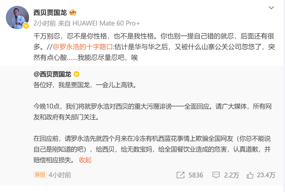 两小时后,贾国龙在微博发布“预告”,称将于晚上10点“就罗永浩对西贝的重大污蔑诽谤一一全面回应”,并要求罗永浩认真道歉、赔偿损失。